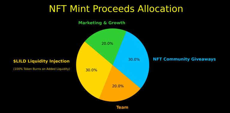 Allocate 50% of NFT sales to gradually add liquidity to the $LILD LP pool with minimal price impact. All LP tokens will be burned after each addition, ensuring permanently locked liquidity, reduced volatility, and long-term stability.